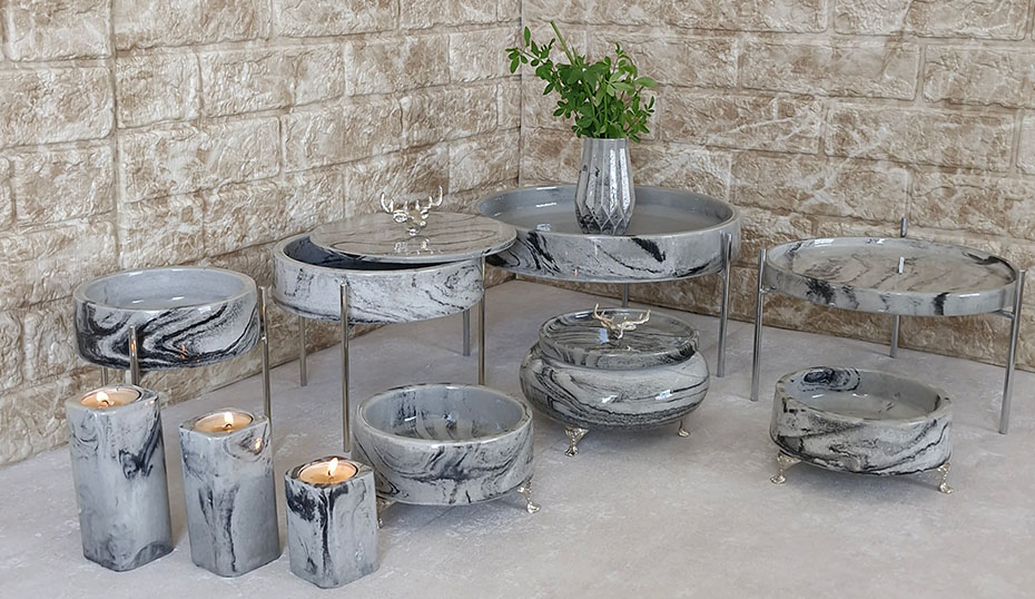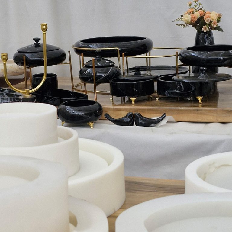 نمونه کارهای خاصی که اولین بار ما توانستیم با فرمولاسیونی خاص انرا تولید و به فروش موفق برسانیم. تولید ظروف پذیرایی از جنس سنگ مهندسی